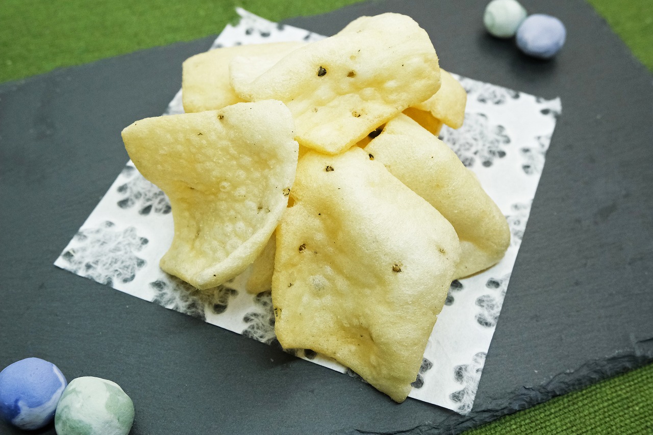 - ごま風味、さっくりソフトな歯ざわり、軽い美味しさの塩味スナック。