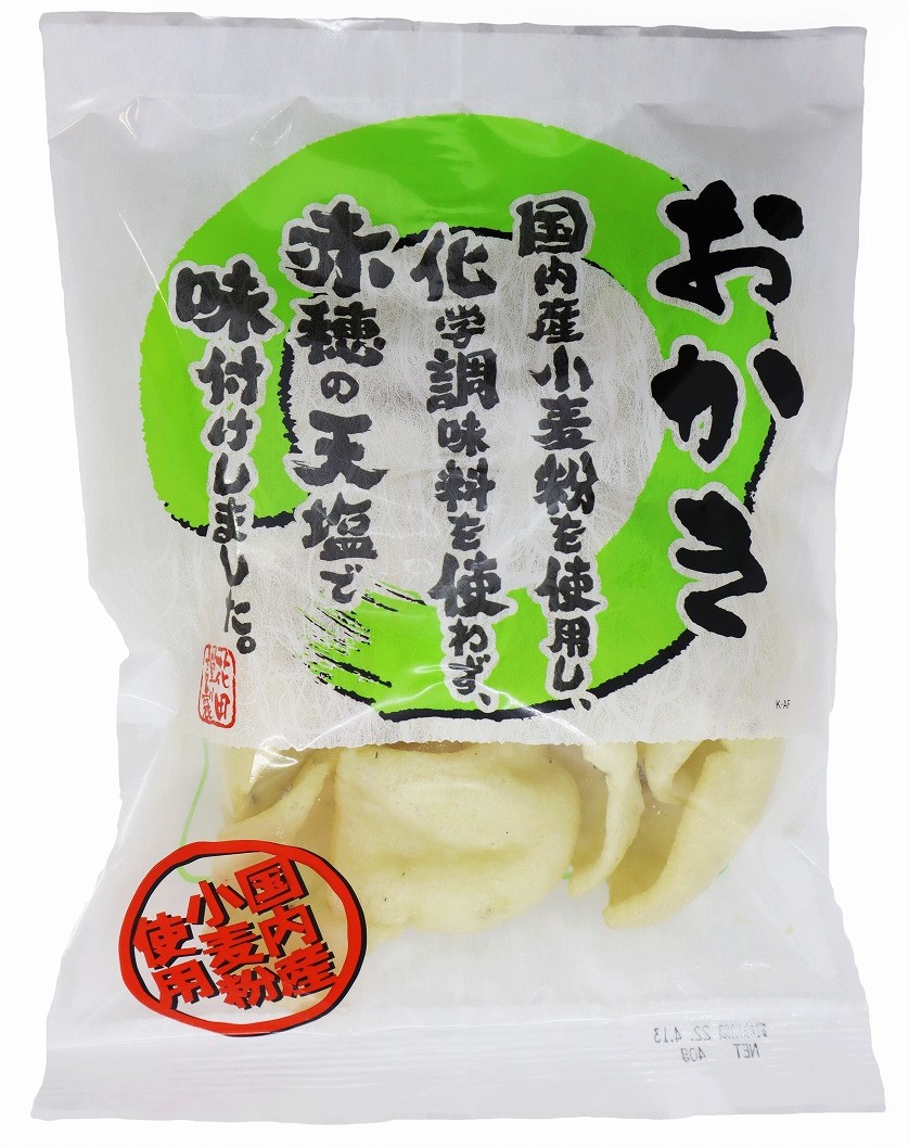- 国内産小麦粉を使用し、化学調味料を使用せず、赤穂の天塩で味付けしました。小麦本来の風味と美味しさを楽しんで頂けます。